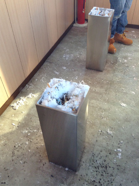 あるサービスエリアの喫煙スペースの中の吸殻入れに、雪を突っ込んでいました。