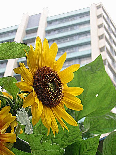 公園の一角に(正確に言うと、都有地ではあるが、公園ではない)野生化した向日葵が開花していた。