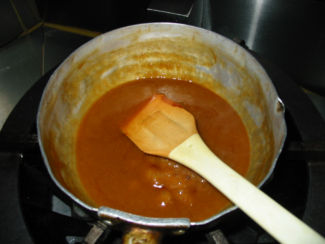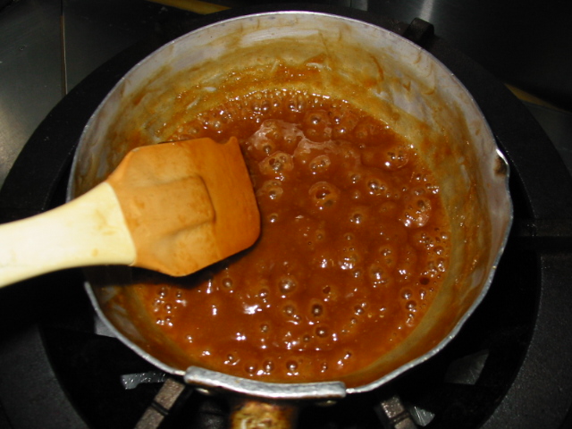 火にかけて、焦げ付きやすいので、かき回し続けながら煮詰めていきます。