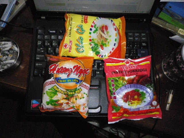 フォーとか、牛肉粥とか、現地の袋麺や袋粥です。